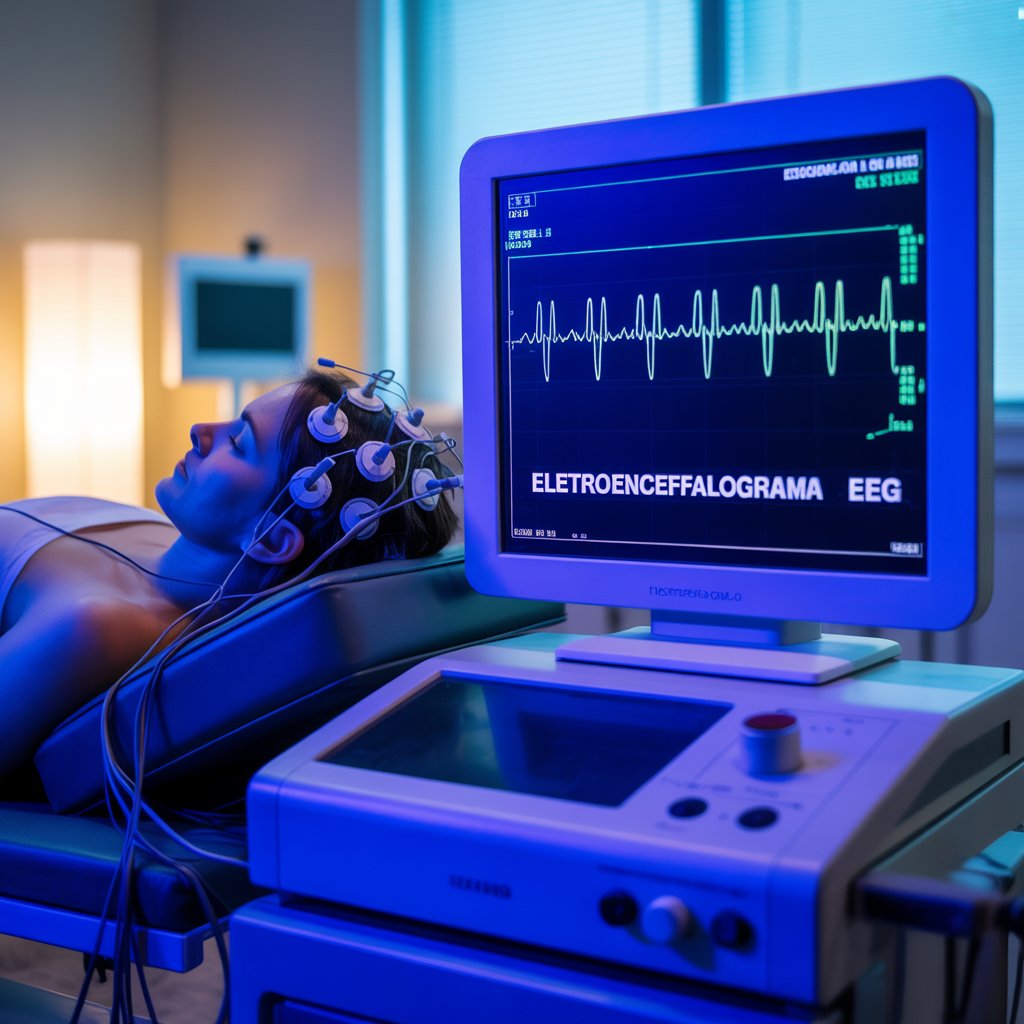 O exame de eletroencefalograma (EEG) registra a atividade elétrica do cérebro por meio de eletrodos posicionados no couro cabeludo. Essencial para o diagnóstico de epilepsia, distúrbios do sono e outras condições neurológicas.