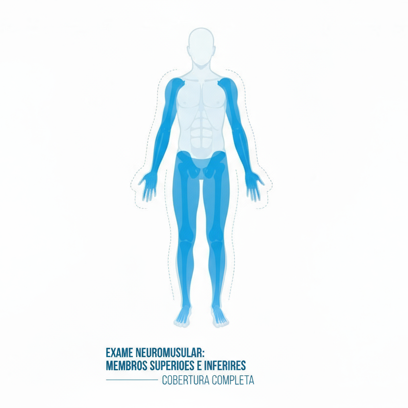 Exame que avalia a função dos nervos periféricos e músculos. Fundamental para diagnóstico de neuropatias, miopatias e outras doenças neuromusculares. Duração: 45-90 minutos, avaliação completa, resultado em 48h.